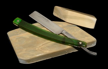 This #9 Les Lat bout is a complete set with a matching slurry stone. This one is mostly hybrid layer, and the yellow Coticule laye is somewhat thin, but there’s enough stone there to last for a very long time.