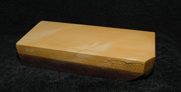 The coloring of the Coticule side shifts from dark amber/gold to a lighter yellow in places. It’s a fairly hard stone, not real hard but definitely not soft.