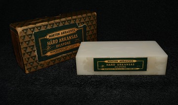 This is a smaller Translucent Arkansas stone from Norton. Judging by the graphic on the box, I believe this one was quarried in the 1940s. While it is a bit small, it’s quite effective as a finishing stone. Care has to be taken because of its size, but after a just few strokes the real estate becomes easy to navigate. This is a very fine stone – capable of putting a super keen and smooth edge on a blade.
