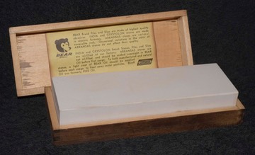 These old Norton pure-white soft Arkansas stones are some of the best of their kind ever quarried. They are exponentially more consistent than just about any soft Arks being offered today. This one is NOS, the stone, wood and label are absolutely pristine. I would guess this one dates to the late 1950s – no mention of Behr Manning, but the Bear Logo is present. Approximately 6 x 2 x 1”.