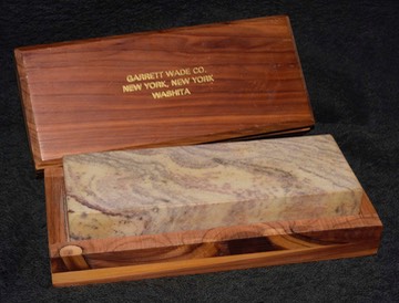 This Wasita was sold by Garrett Wade in New York, but it was probably cut and boxed by Norton or Smiths. It’s a marbled Washita, probably dating to the 1960s. It does seem to be spotless, but there is a light oily fragrance – yet no signs of use. Perhaps this was a ‘shop-queen’ stone hoarded by a frugal collector? Who knows – it’s certainly gorgeous to look at though. Approximately 6.0 x 2.0 x 1.0” / 450 g.
