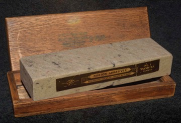 Here’s an old, possibly 1940s, Norton WM-6 No. 1 Washita. The coloring is outrageous for a #1, I’ve never seen this before. The stone and box have a faint essence of machine oil but the stone is clean. The inside bottom of the box shows some staining, but not typical use stains. The top of the box seems to be unused. The label on the stone has been sealed. Overall, this is a super clean example of a very unusual Washita.