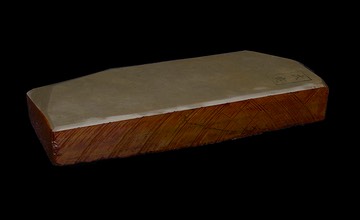 The sides and bottom have been sealed with 3 very thin coats of cashew lacquer; the top is lapped and the edges have been chamfered. Note the Ozuku stamp is still visible – I did lap this stone but I left that corner alone; I wanted to keep the stamp. Near the opposite corner on that side, there are a few shallow pock-marks that don’t interfere with honing so I left them too. I could dress this stone down to ‘perfect’ – but it’s not necessary to do so.