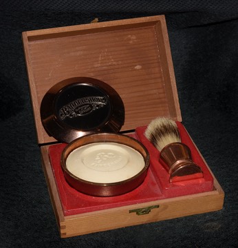 This Franklin Toiletry gift set was packaged in a nice wood box. Upon lifting the lid, we find a heavyweight metal bowl with the Old Fashioned Luxury logo emblazoned on the lid, a puck of tallow shaving soap, and a boar bristle brush with a metallic-finished plastic handle.