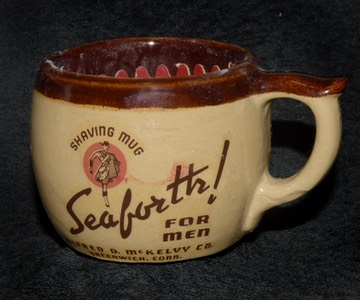 Seaforth logo shaving mugs are a real treat. They are little tanks, more of a crockery type of vessel actually. I am dating this set as post 1942 – that is when the Seaforth factory moved to the Connecticut address seen on the side of the mug. Also, the patent number on the mug’s inner lid is for that cardboard retainer, and it was issued to Alfred D Mckelvy in 1942.