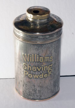 Shaving powder was sort of a oddity, basically, it was flaked shaving soap. The top of this tin revolves to reveal an opening. The idea was to pour some of the powder into a bowl, and then add hot water. The resulting soup could then be lathered normally with a typical shaving brush.