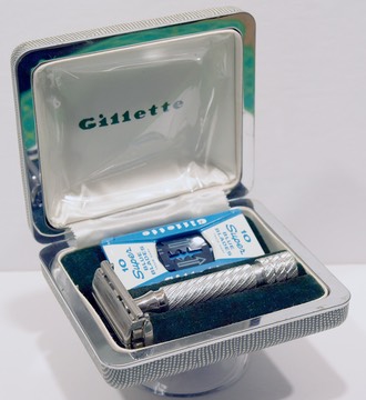 These Gillette Aristocrat #66 razors were made in England in the early 1950s. The plating is Rhodium, and it still shines brightly. The bulldog barber pole handle is not only gorgeous, it’s easy to hold onto with wet hands.