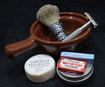 Designed for leg-shavers, The Lady Gillette Safety Razor Kit includes a vintage razor, a puck of soap and a container, a badger brush, styptic pencil, and a handled lather bowl.