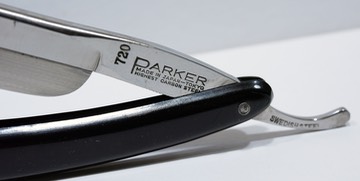 Parker razors are top-quality offerings. I especially love their frame backs, I put them on par with Towa razors. I have a 720 in my own rotation right now, but this one here appears to be NOS. The width is 6/8, the original scales and wedge are plastic. There are jimps below, and the pivot is snug.
