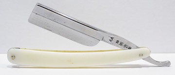 This Towa AA Japanese Frameback straight razor is very cool, the kanji on the front and back translate to “Sudden Death” and “Superstition”. The blade measures 6/8+ and there are jimps below. The scales and wedge are plastic, everything appears to be original.