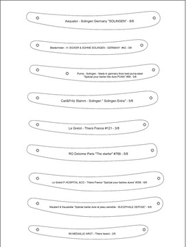This template is for the following straight razors: Aequator - Solingen 6/8”, Bledermeier - H. Eicker & Sohne Solingen #42 3/8”, Puma #69 - 5/8”, Carl & Friitz Stamm Solingen - 5/8”, Le Grelot - Theirs France #121 - 3/8”, RO Delome Paris “The Starter” #769 - 5/8”, Le Great P. Hospital & Co #356 - 6/8”, Maubert & Sauzedde Special Barber Sure Et Peau Sensible - Bucephale Depose - 6/8”.