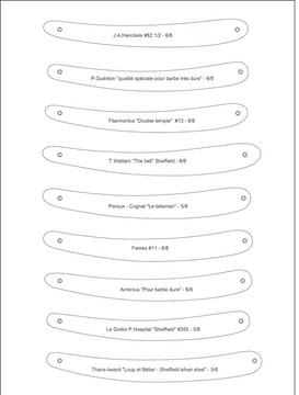 This template is for the following straight razors: J.A. Henckels #82 1/2 - 6/8”, P. Gueriton “Quality Speciale Pour Barbe Tres Dure” - 6/8, Filarmonica “Double Temple” #13 - 6/8”, T. Wattam “The Bell” Sheffield - 6/8”, Porous - Cognet “Le Talisman” - 5/8”, Famex #11 - 6/8”, Arminius “Pour Barbe Dure” - 6/8, Le Great P. Hospital “Sheffield” #355 - 5/8”, Theirs-Issard “Loup et Bellier - Sheffield Silver Steel” - 5/8”,