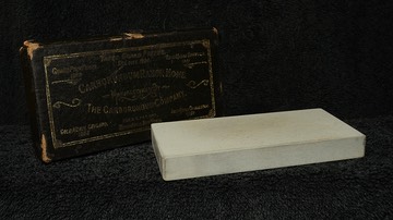 This hone was lapped flat and the edges were chamfered. The original box is worn, but still pretty solid and quite serviceable.
