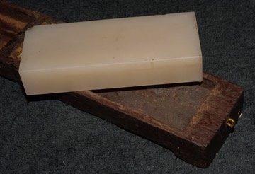 A lovely Translucent, measuring 5x2x1, with sort of a butterscotch tinge. The box is unique, hand made, and extremely old. The stone fits with zero wiggle – a perfect fit all around. The original hinge was leather that rotted out and was replaced by brass hinges. I have to assume this set up was from the 1800s, later boxes for Arks do not show this level of craftsmanship, or attention to fit. I also have to factor in that leather takes a very long time to rot and crumble.