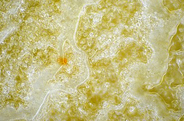 This is medium-thick slurry on a Les Latneuses yellow Coticule. Objective – Neo Splan 20x Relay lens – 3.3x Illumination – Reflected Darkfield