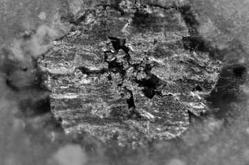 This image shows a metallic inclusion that formed inside a small hole, or ‘Su’, in the working surface of a Suita Toishi. Objective – Neo Splan 20x Relay lens – 2.5x Illumination – Reflected Darkfield