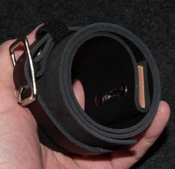Over the last year, I’ve been testing one that I made for myself, and working on refining the design. The 2.5” Midnight Steerhide handles being rolled up nicely, and I swapped out the snap closure for a very secure center-bar buckle. The keeper is made from two-sided hook/loop material. It breaks down easily, rolls up easily, and assembles for stropping easily too. The leather is super flexible and very resilient – you can splash water on it and it’ll just wipe off without leaving a trace. At this point, I believe that this is ‘the one’.