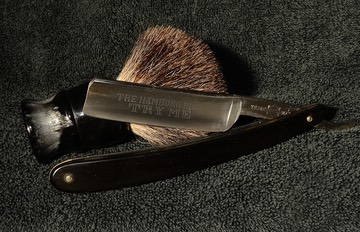 Hamburg Ring 6/8 Hollow Grind 6/8 hollow grindOriginal hard-rubber scales and plastic wedge. A crack through the pivot-pin hole has been repaired; the fix is tested, solid and stable.