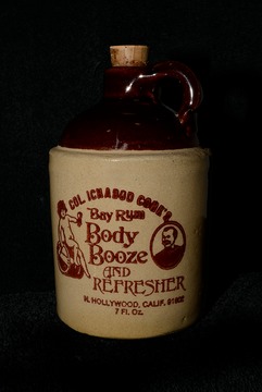 Here’s a Pottery jug that once contained Col. Conk’s Body Booze. The jug was manufactured in the USA, and it has a cork stopper. With the stopper in place it stands 5” tall, and it’s 3” in diameter at its widest point just above the lettering.